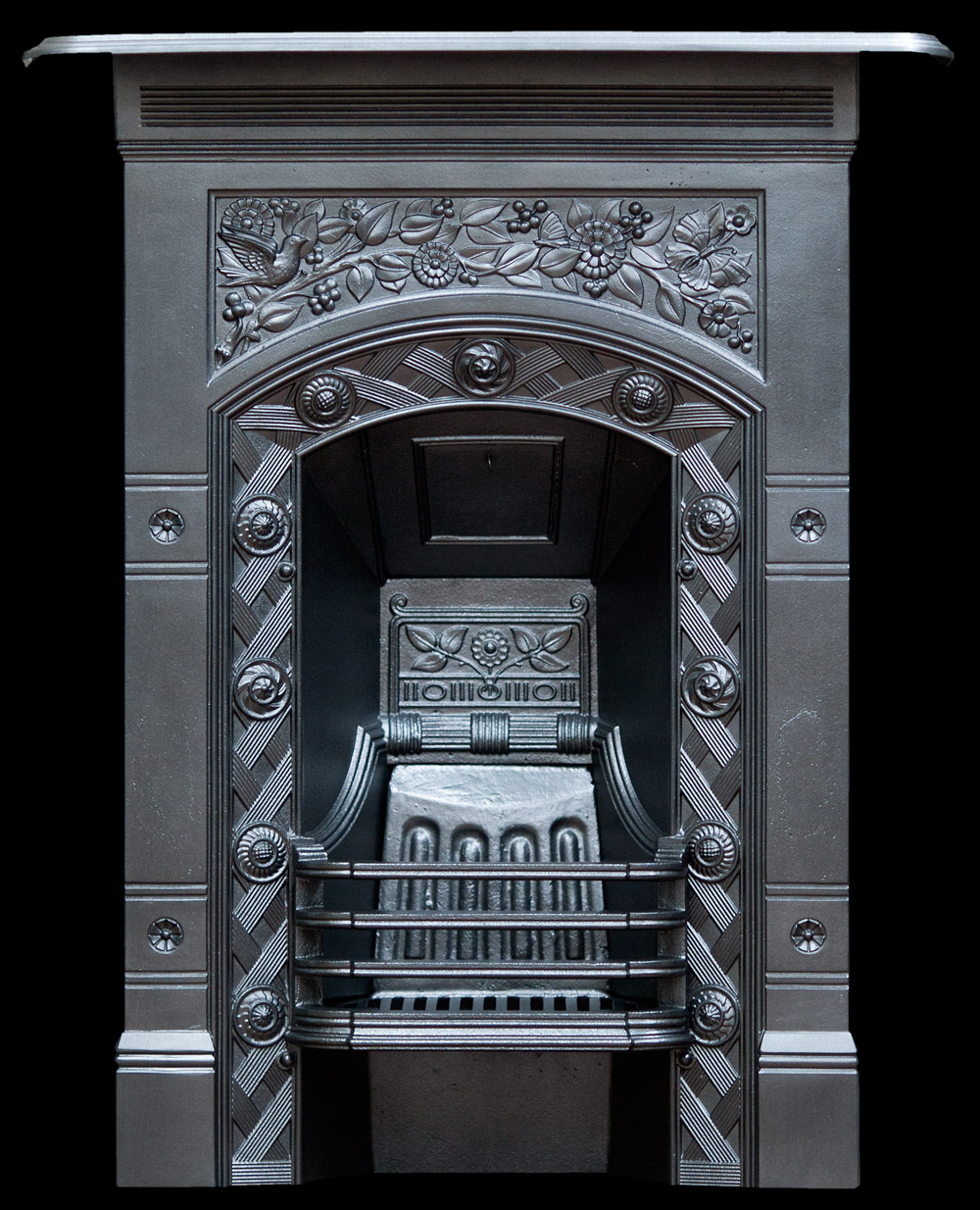 Bedroom Arts and Crafts fireplace in the manner of Thomas Jeckyll ( 1827 – 1881 ) who worked for the Barnard, Bishop and Barnard iron foundry Norwich . The fireplace is beautifully decorated with a songbird and butterflies on a background of leaves and berries . Circa 1880 .