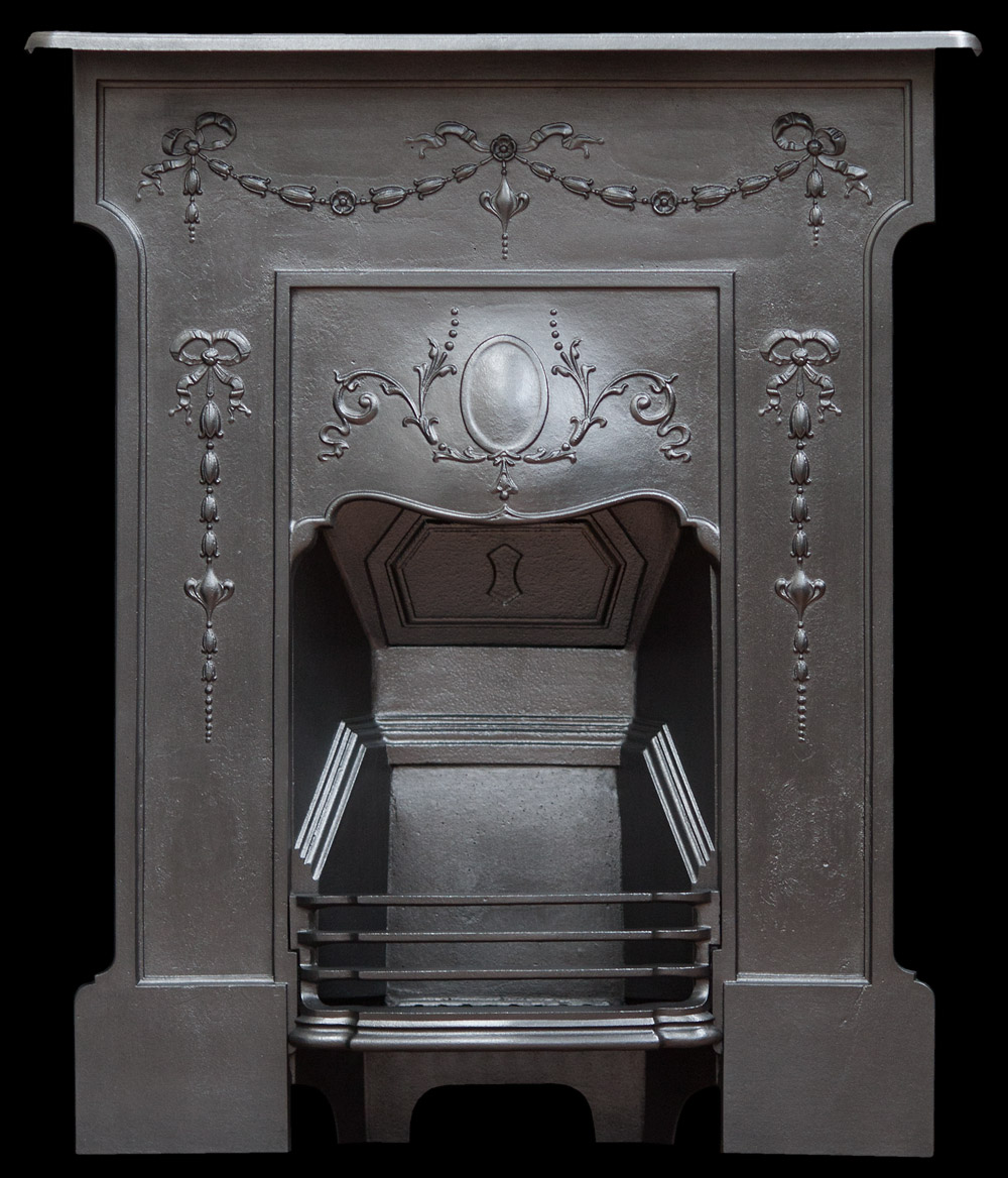 Edwardian cast iron combination fireplace which is beautifully decorated with swags and bows . Circa 1908 .