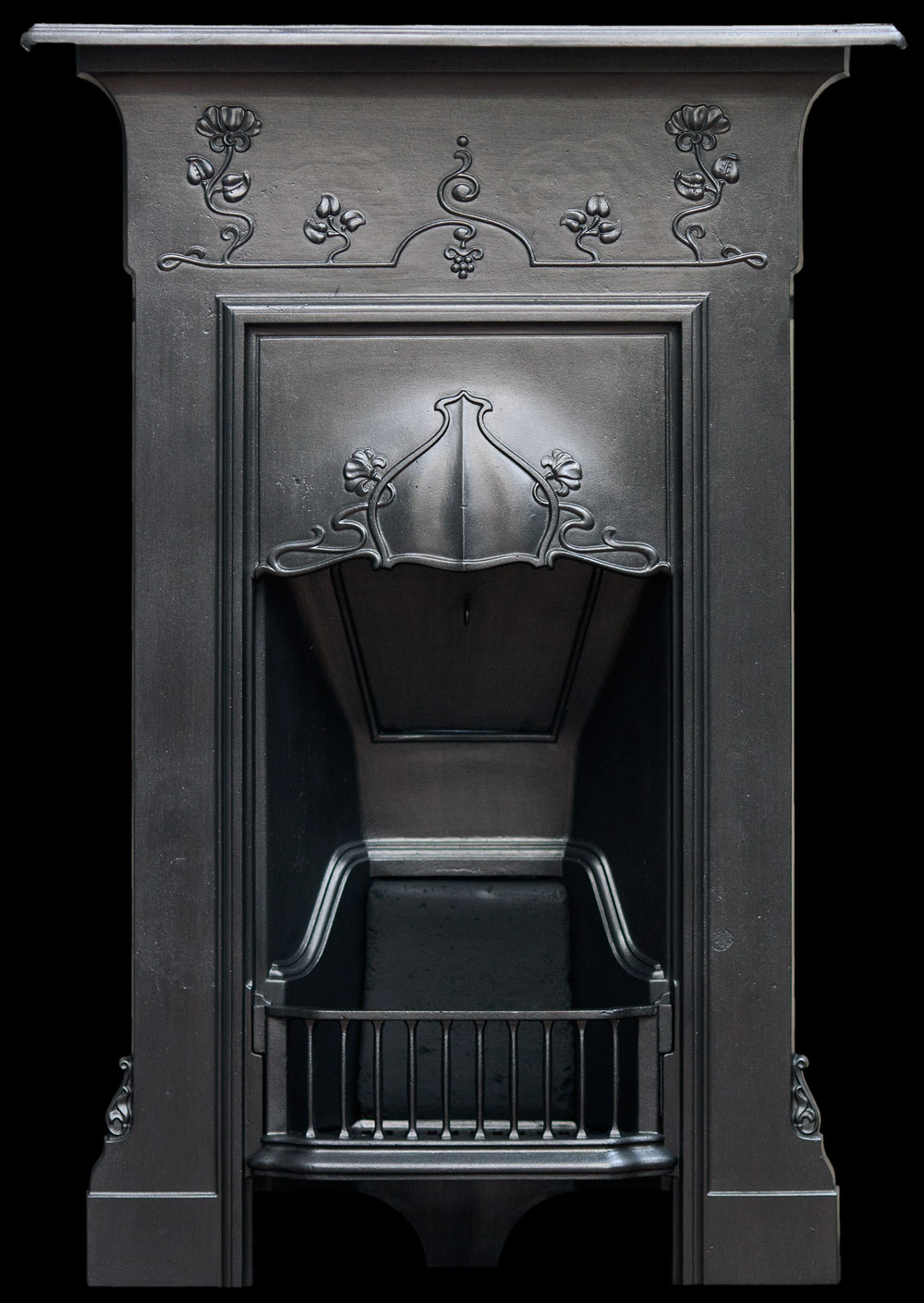 Reclaimed Edwardian fireplace with stylised flowers to the frieze and canopy .